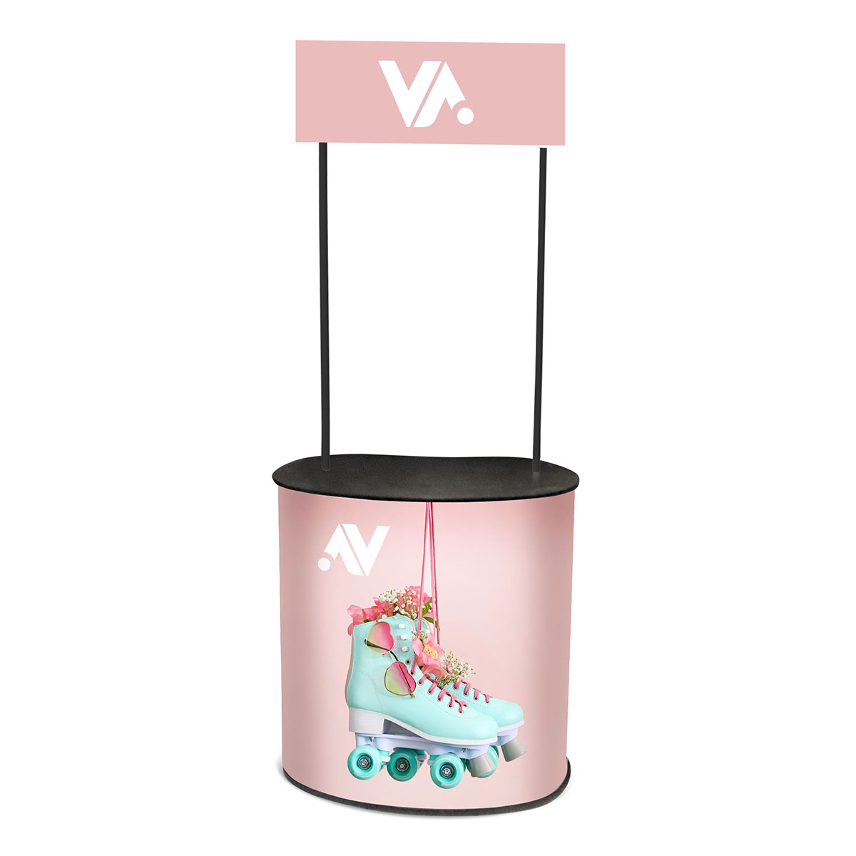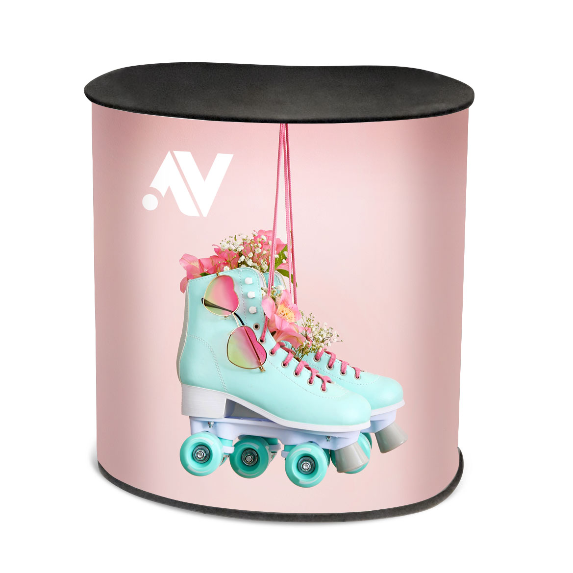 Ladę AVLA tworzą dwa blaty z płyty meblowej w kolorze czarnym, korpus w postaci rolety z tworzywa, grafika mocowana do korpusu na rzep, całość pakowana do dwóch toreb transportowych.
