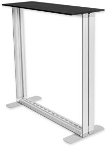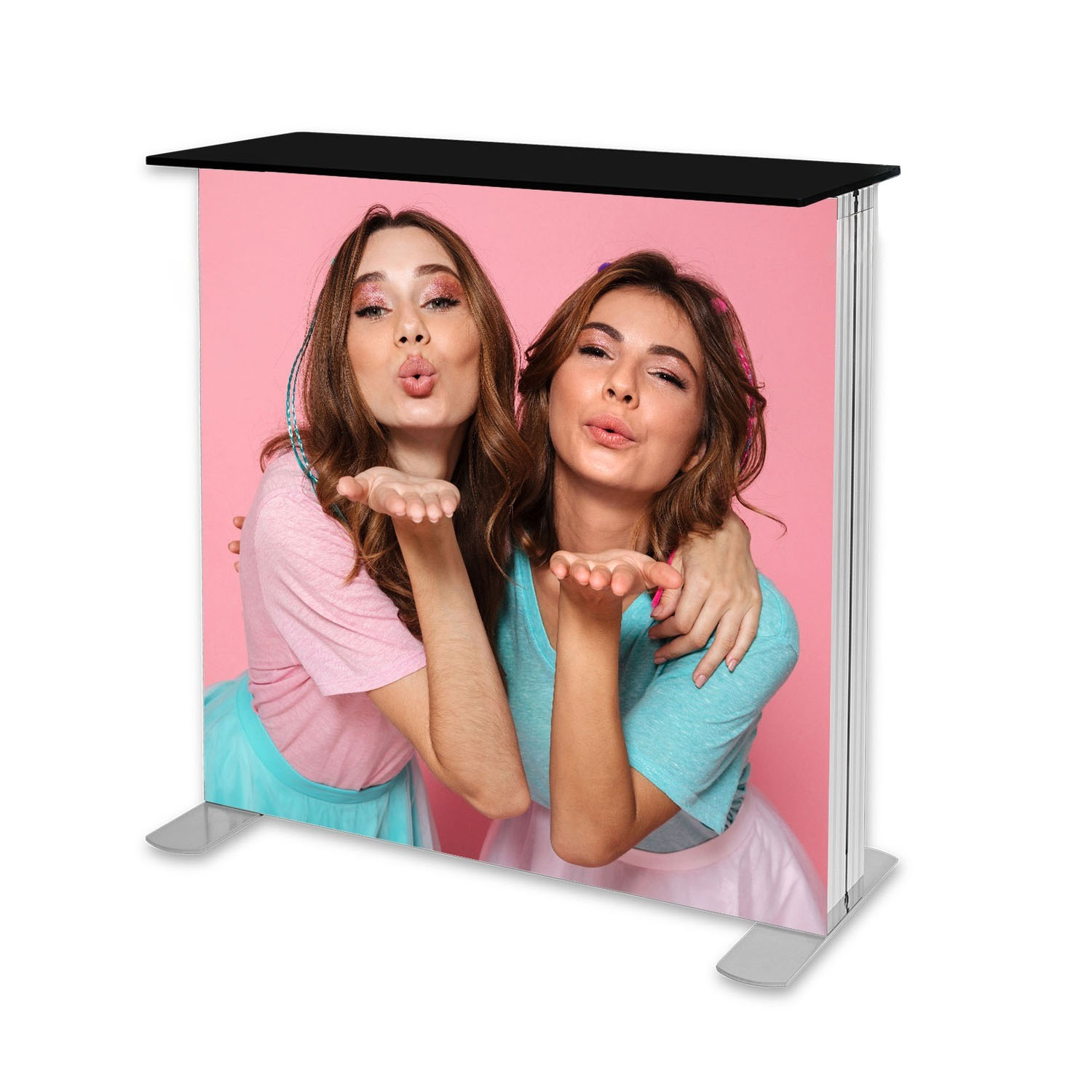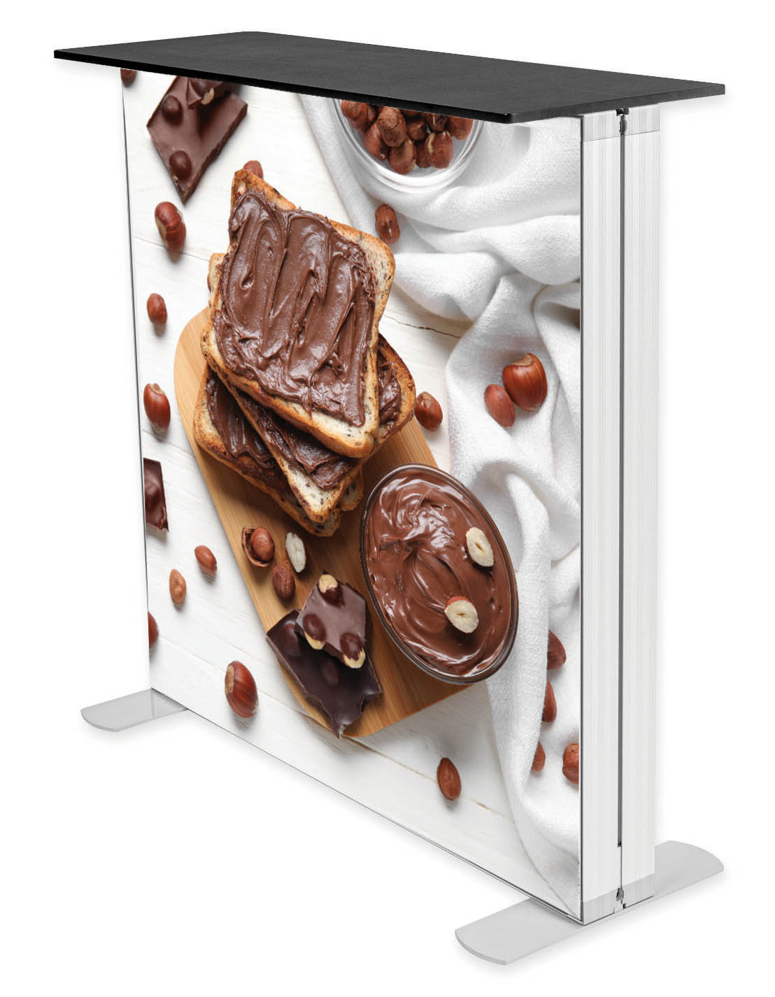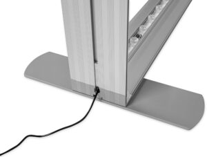 Dwustronna trybunka o szerokim, aluminiowym profilu (12 cm), z wbudowanym oświetleniem LED. Wydruk montowany za pomocą taśmy siliko