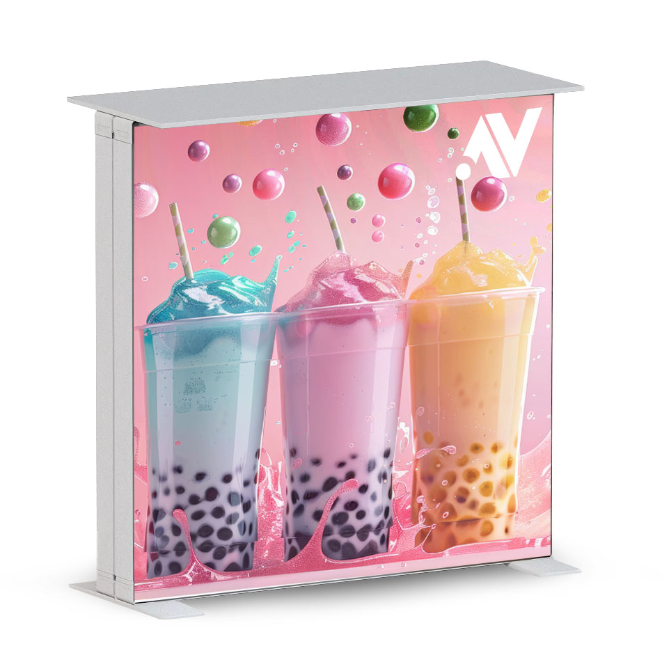 Konstrukcja lady z elementów z białego tworzywa , specjalnie wyprofilowany profil umożliwia montaż grafiki na wcisk, nóżki nadają ladzie stabilności, a podświetlany moduł led podświetla równomiernie grafikę na całej powierzchni frontowej lady.